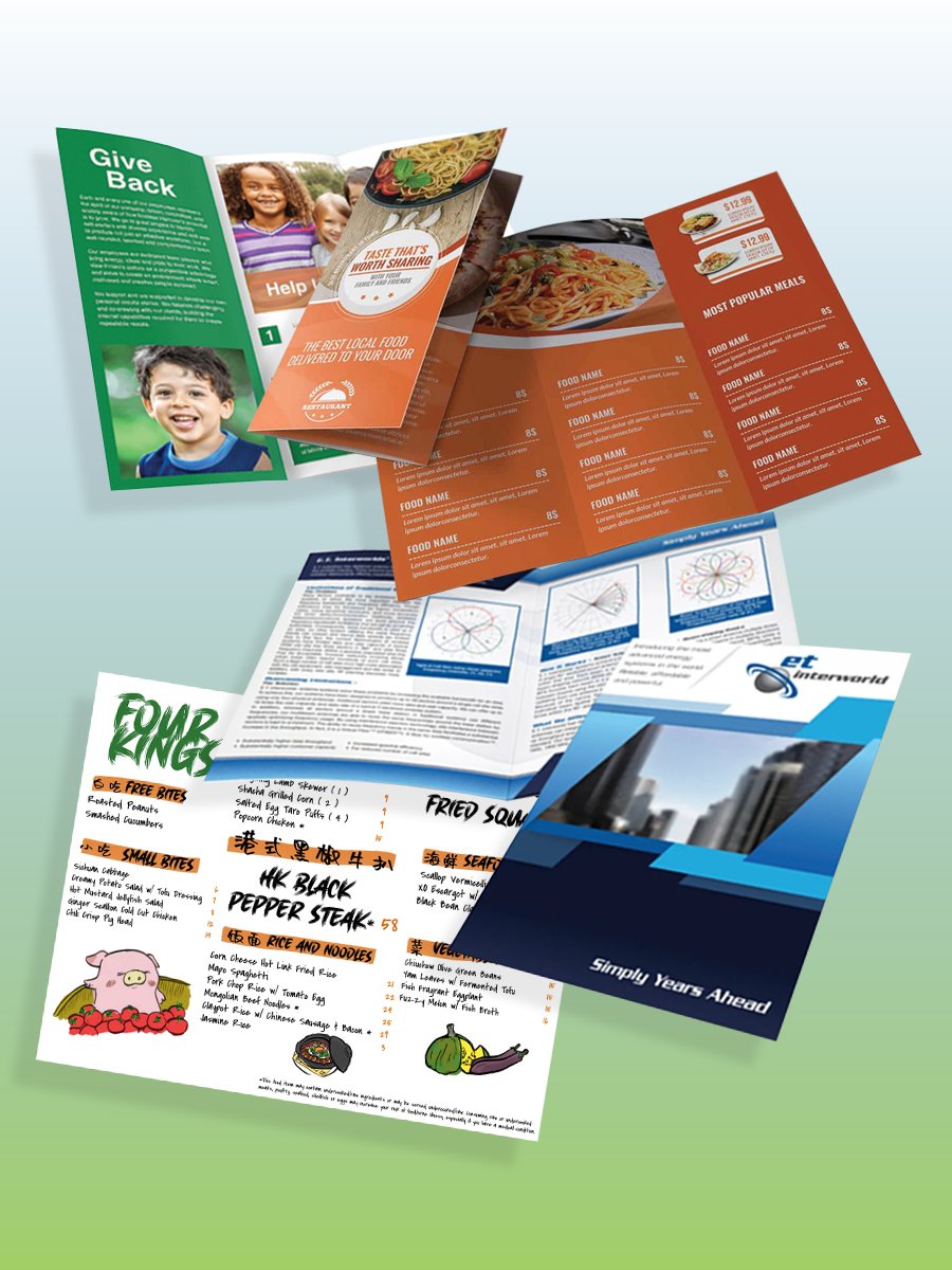 Order small batches or bulk quantities to meet your marketing needs. Get professional, full-color brochures and menus that impress customers and elevate your brand.